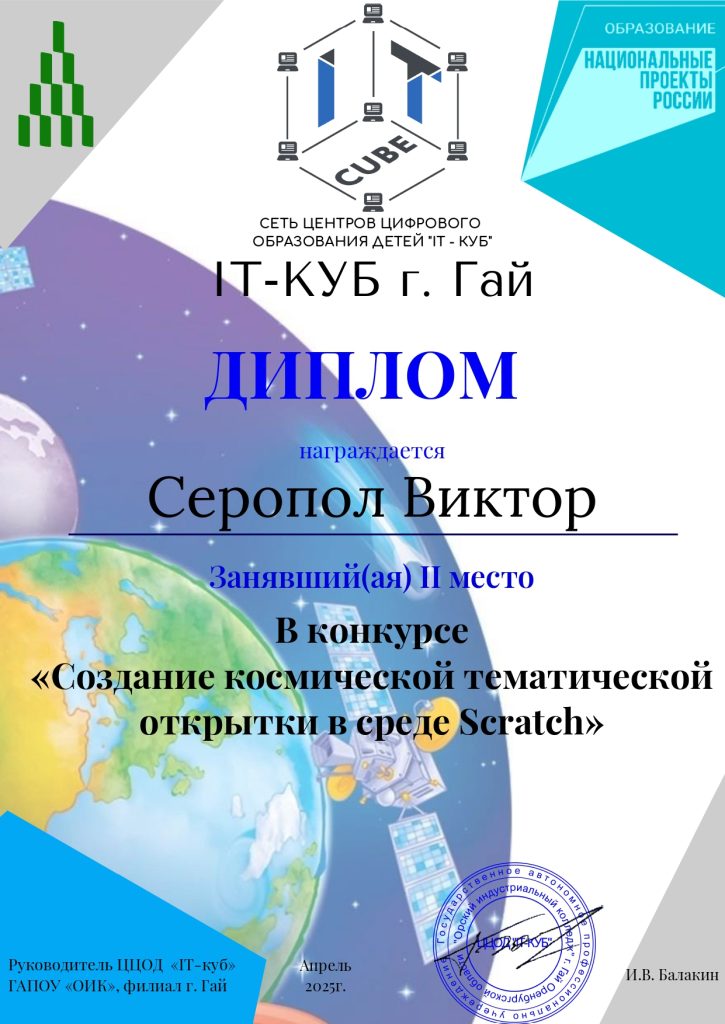 В начале апреля, в преддверии празднования Дня космонавтики Центр цифрового образования «IT-Куб» ГАПОУ «ОИК» г. Гай объявил о проведении всероссийского творческого конкурса «Создание космической тематической открытки в среде Scratch».