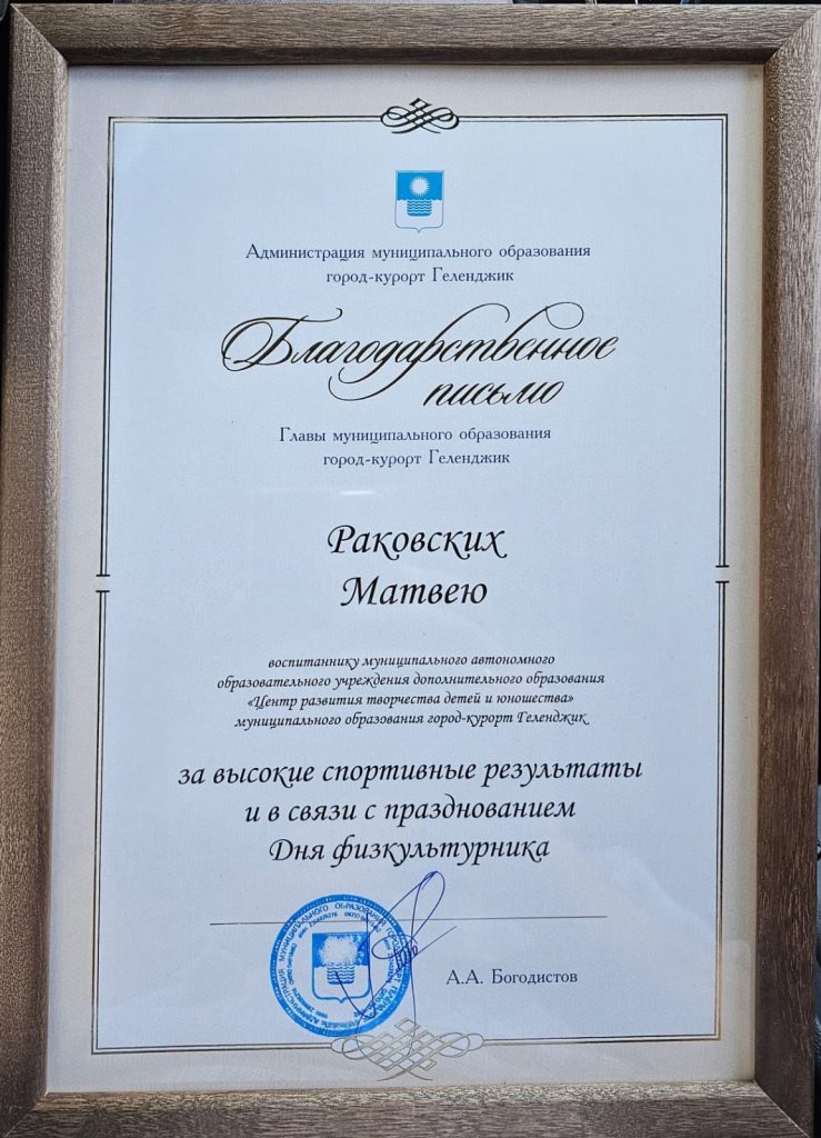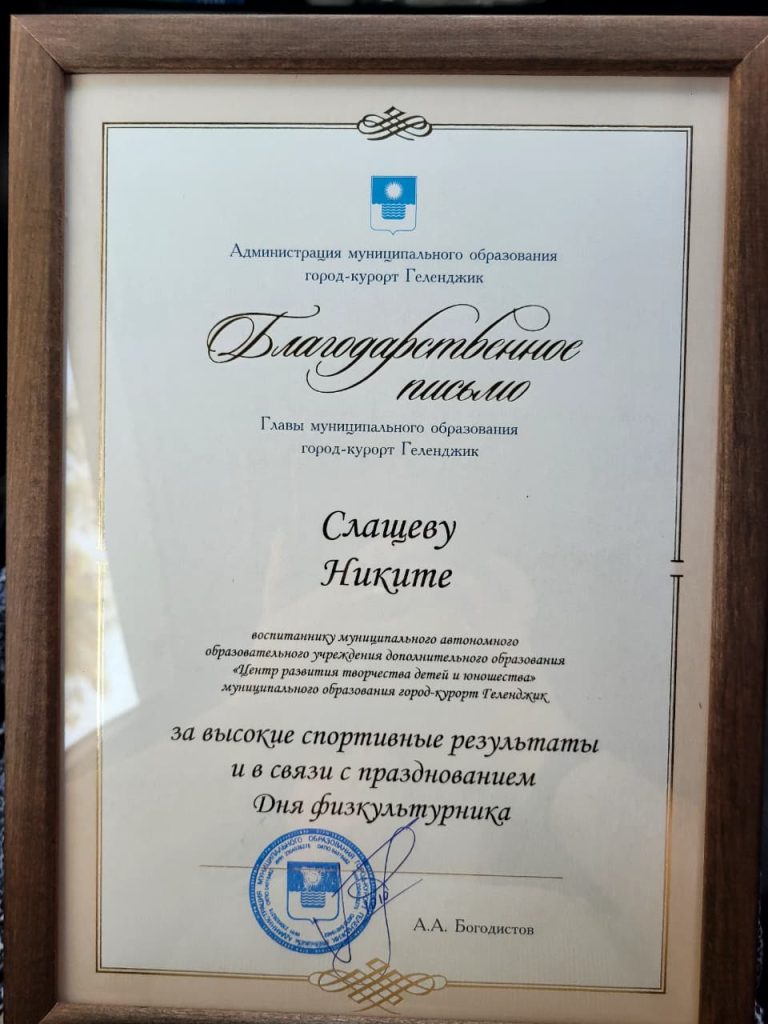 Поздравляем Слащева Никиту и Раковских Матвея, которые были награждены за высокие спортивные результаты и в связи с празднованием дня физкультурника Благодарственным письмом Главы МО г-к Геленджик Богодистова Алексея Алексеевича!