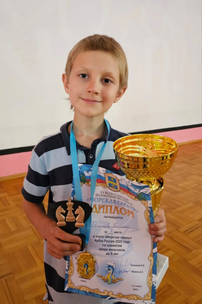 В возрастной группе мальчики до 9 лет — 1 место занял Бирин Евгений (7,5 очков из 9).