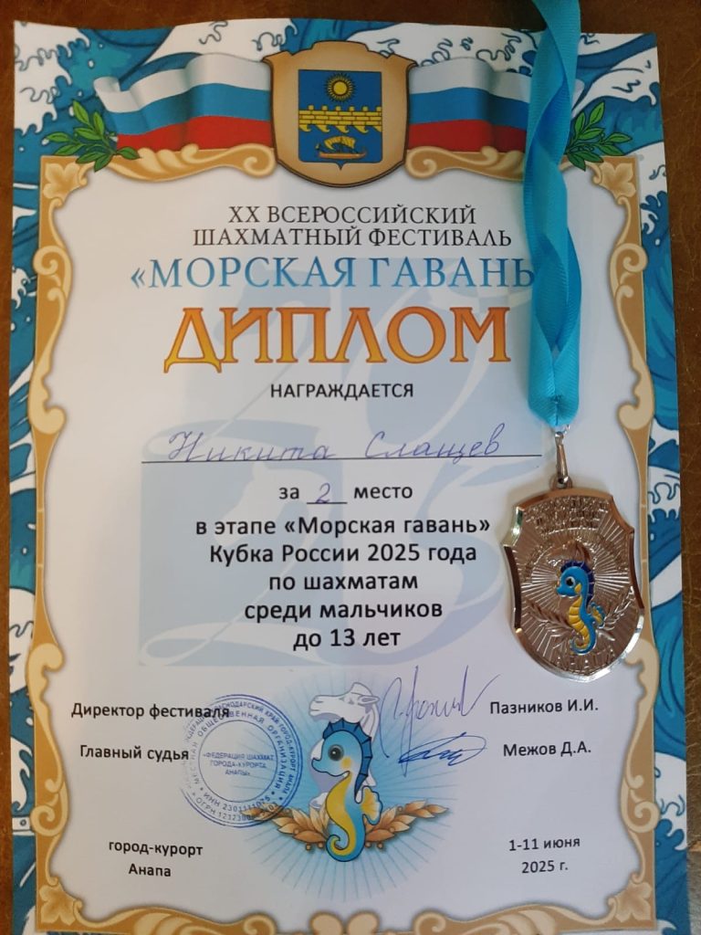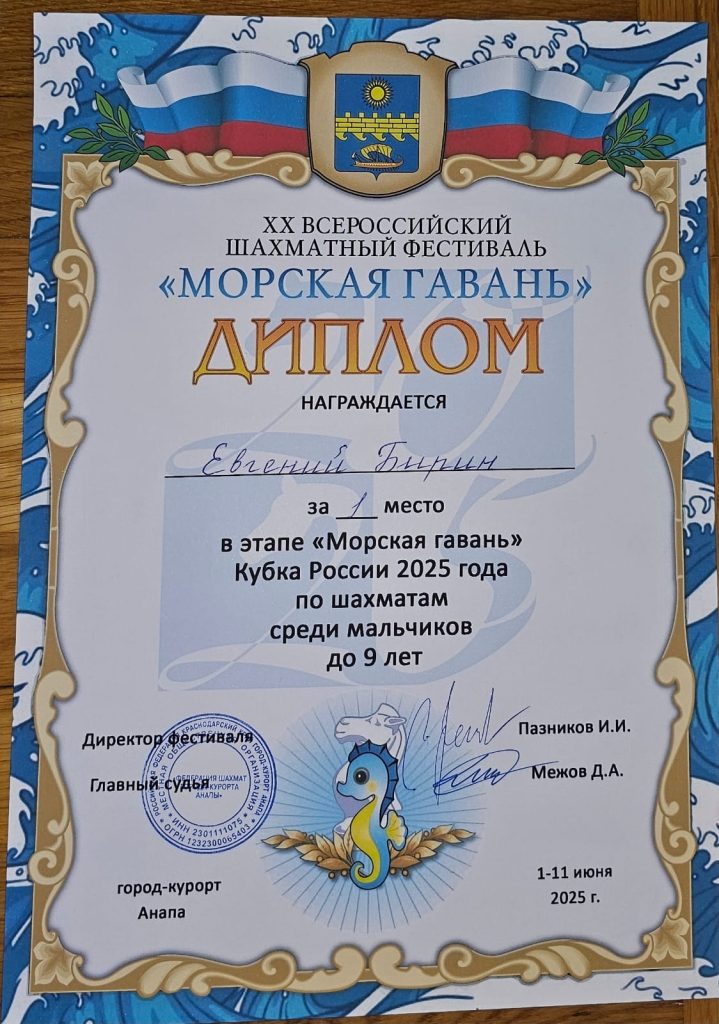С 1 по 10 июня в Анапе проходил XX Всероссийский шахматный фестиваль «Морская гавань» — этап детского кубка России по шахматам. Успешно выступили на этих соревнованиях учащиеся МАОУ ДО ЦРТДиЮ (тренер Перегудов Михаил Юрьевич).
